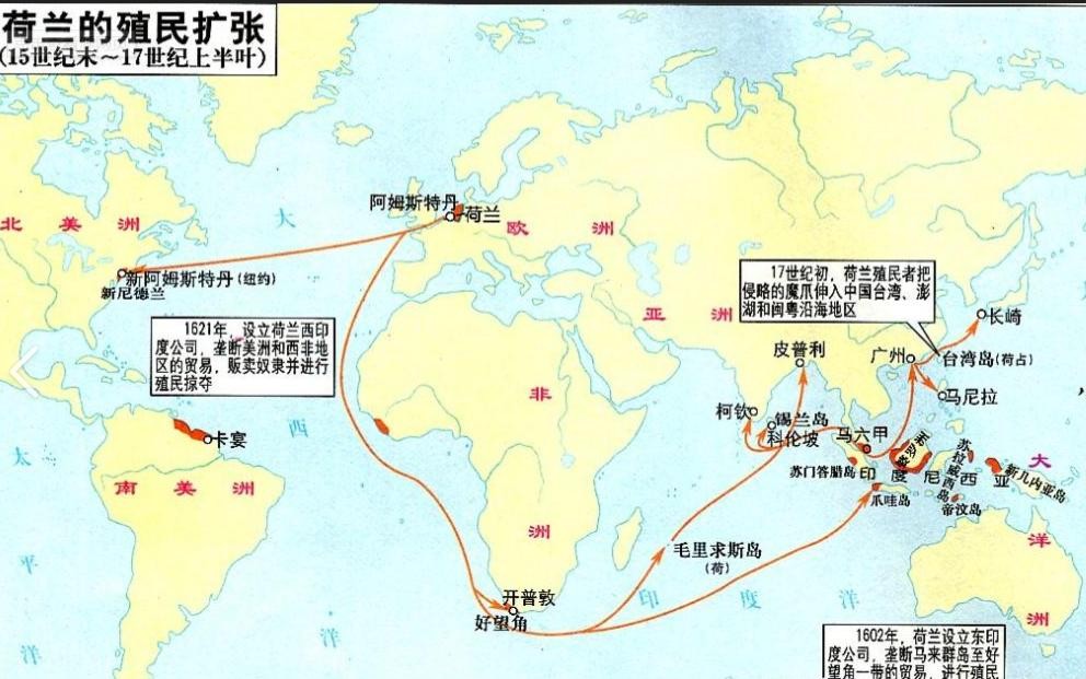 荷兰的商人们与海军合作,频繁袭击并逐步侵占葡萄牙和西班牙的殖民地,凭借海上贸易和殖民地的扩展,荷兰迅速成长为一个世界强国。