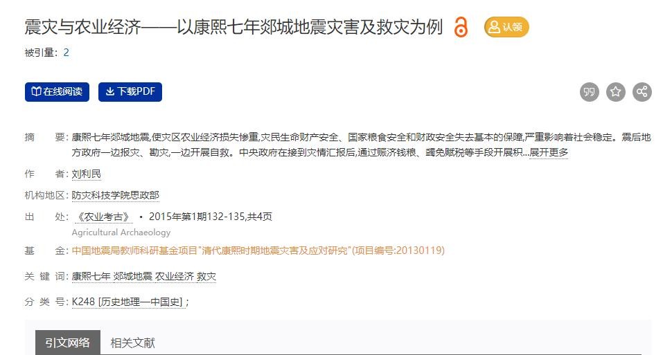 参考资料:[1]刘利民.震灾与农业经济——以康熙七年郯城地震灾害及救灾为例[J].农业考古,2015,0(1):132-135