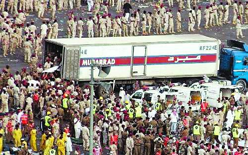 快到目的地时,因为一些朝圣者没有按照官方要求行事导致人群发生拥挤,最终造成踩踏事故发生。朝觐者露营休息的米纳地区,由于死伤人数众多,当局出动超过200部救护车和四千多人,到场展开救援,现场一片混乱,不少人躺在地上,杂物满地。为了避免意外扩大,当局正把人潮分散,并指引朝觐者从其他不同通道前往圣城。