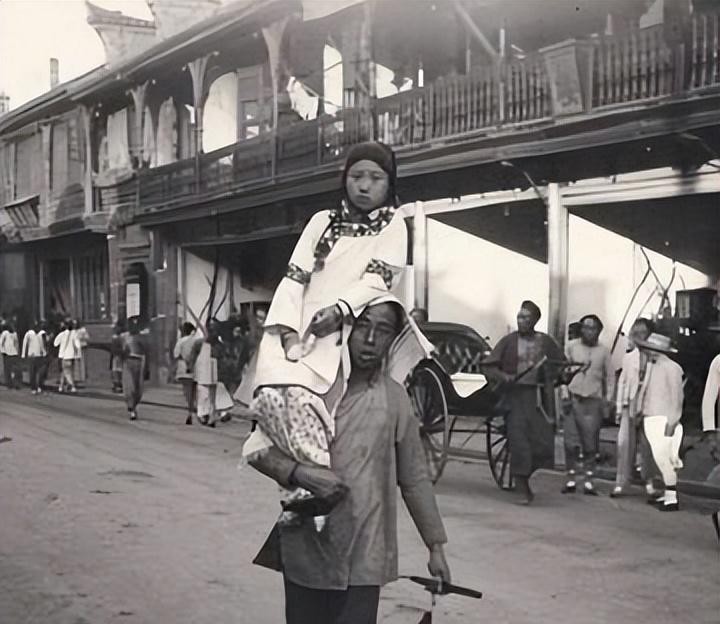 一位苦力扛着女顾客正在行走,身边的人都在看向他们,毕竟当时的人都很保守。