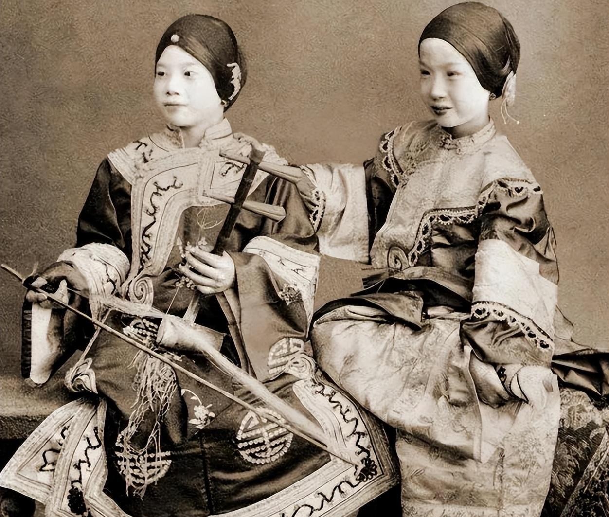 年在中国香港拍摄的两名歌妓,她们似乎还很年轻,面带微笑地向顾客卖艺。