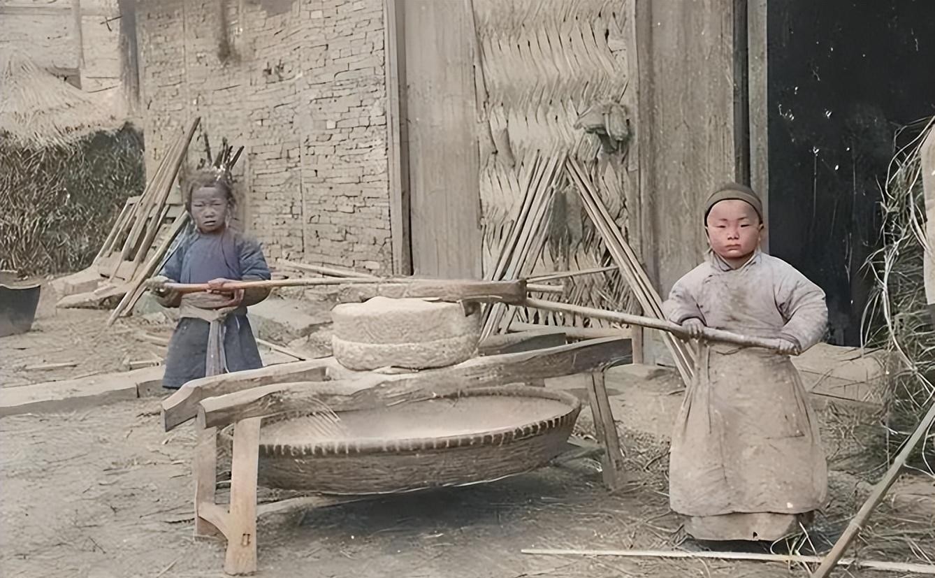 正在拉磨的小男孩,小小年纪推动这么大的碾盘
