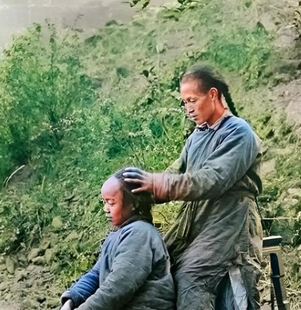 清末时期的一名父亲给孩子捉头上虱子的照片