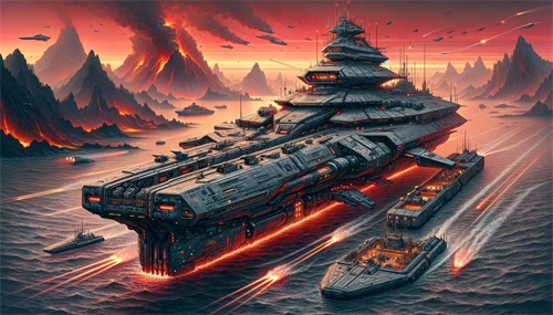 设计:主战舰巨大,设计精美,具有流线型的角度和厚重的装甲板。战舰上配备了多层的炮塔、导弹发射器和能量武器。主战舰上附带有小型、灵活的战斗舰,这些小型战舰设计用于快速停靠和发射,以便进行防御和攻击任务。