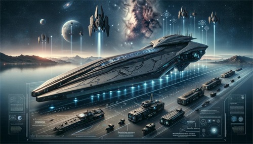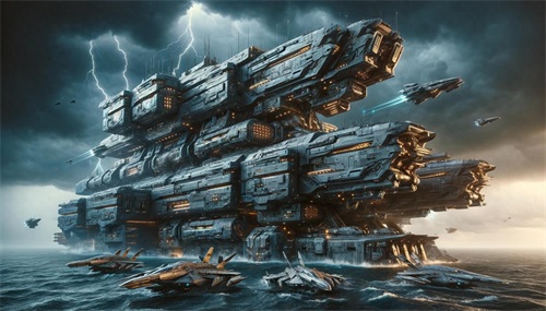 设计:具有分段模块化结构的主战舰,允许快速重新配置和修复。战舰配备量子鱼雷、能量护盾和轨道炮阵列,用于远程攻击。战舰内部设有高科技医疗舱、工程舱和无人机指挥中心。战舰的模块化舱室内停靠着较小、灵活的战斗舰艇,准备快速部署。