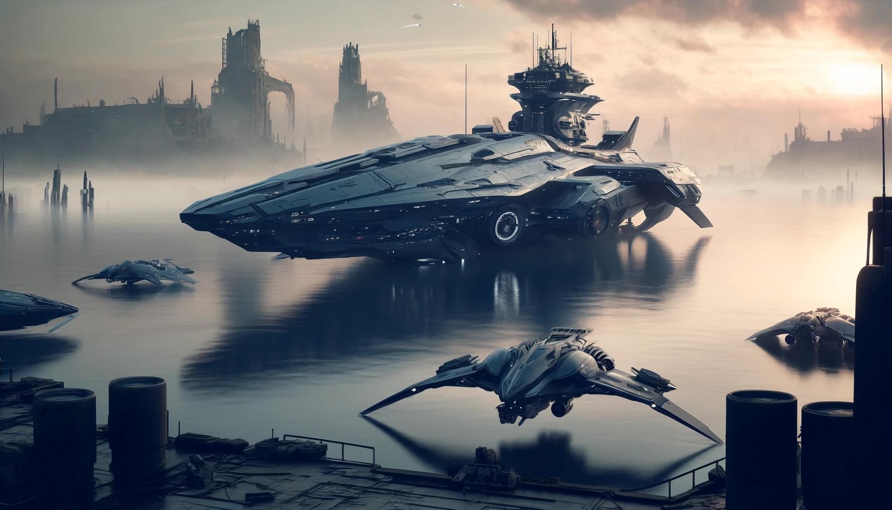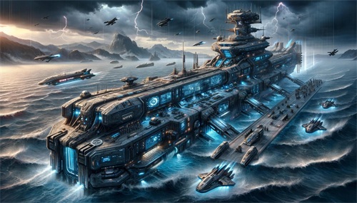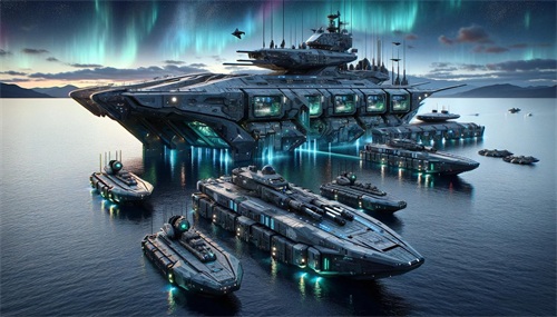 设计:具有更加流线型和空气动力学的主战舰,具备先进的隐身能力。战舰表面光滑且具有反光效果,可以融入环境。该舰配备了高功率激光炮、电磁脉冲生成器和先进的雷达系统。战舰两侧停靠着较小的自主无人机舰艇,能够独立进行侦察和快速打击任务。