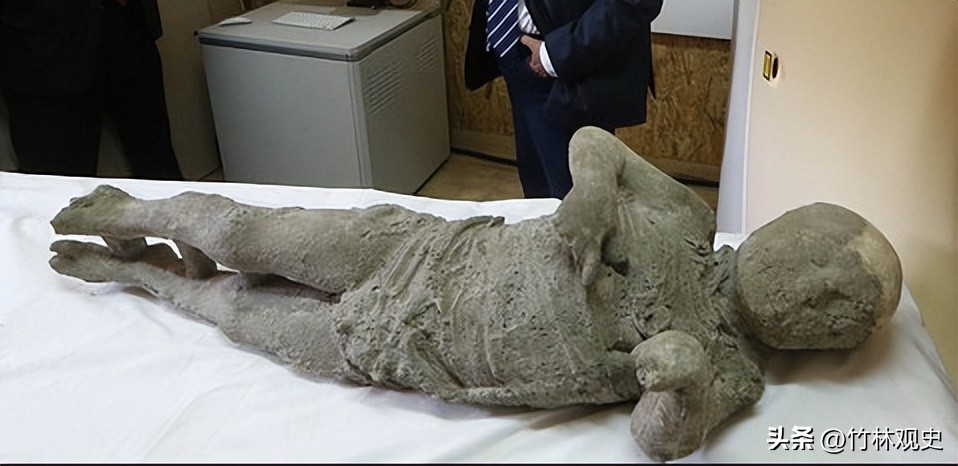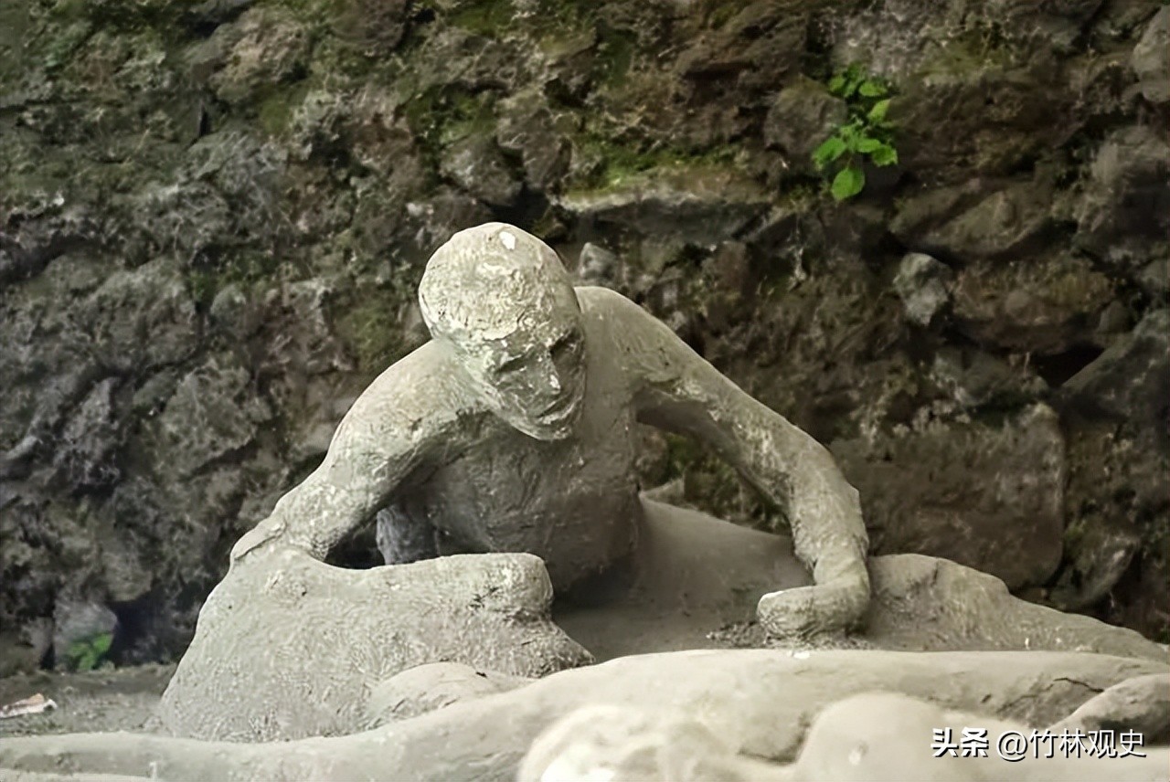 覆盖着火山灰的尸体腐烂以后,在火山灰中形成了一个空壳,后来挖掘者将石膏倒入其中,形成了一个躯体的石膏倒模,保持着刚死亡时的形态。