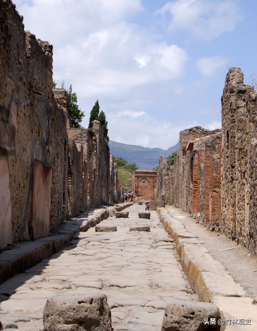 在后面的考古发现中发现,在庞贝这里的街道由大块的黑色火山岩拼接而成,表面闪闪发光,上面还有很多深深的车辙印(古代庞贝人的足迹,是他们曾经在这些街道上驾车奔波的记号),奇怪的是,庞贝的人行道要比街道高出许多,最高的时候能高出1米,为了可以让行人轻松跳下人行道、穿过马路,路面上往往会安置几块垫脚石。到底为什么要垫脚石呢?