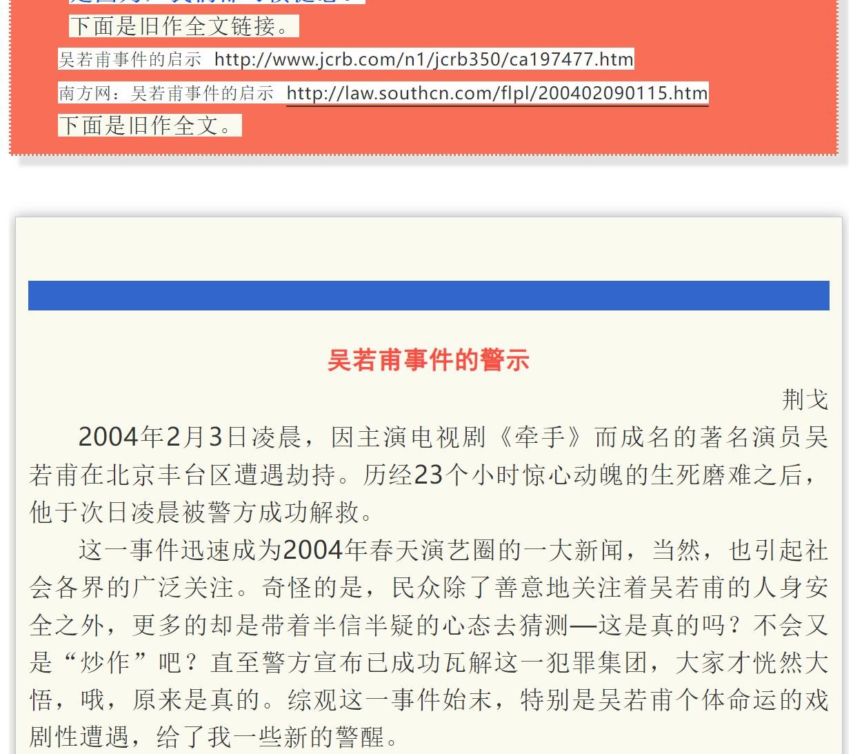 在回顾旧作时,一篇发表于2004年、署名“荆戈”的时评文章《吴若甫事件的警示》吸引了我的目光。吴若甫事件犹如一颗重磅炸弹,在当时社会上掀起了巨大波澜,其后还被改编成电影《拯救吾先生》,成为人们闲暇时热议的焦点。