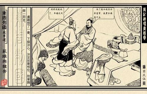 一次须贾出使齐国,范雎作为须贾的随从见到了齐王。齐强魏弱,在交谈中,齐襄王盛气凌人,须贾则唯唯诺诺,范雎见状,关键时候插言几句,一则软中含硬地阻击齐王的咄咄逼人,维护魏国的尊严;二则也是给主人个下台的台阶。齐襄王感到须贾平庸,而须贾的家臣范雎却思维敏捷,吐谈不俗,认定范雎是位人才,当晚便派人劝说范雎留在齐国,以客卿相处,但是范雎谢绝了。范雎说:“我与使者同出,而不与同入,不信无义,何以为人?”
