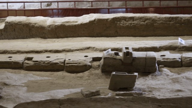 博物馆分地下一层,地面两层,地下一层深藏着定鼎门的前世今生,除了考古发掘出的定鼎门遗址门道、柱础石、城墙等,考古探方里还出土过骆驼的脚印,千年足迹回荡着西域的驼铃。