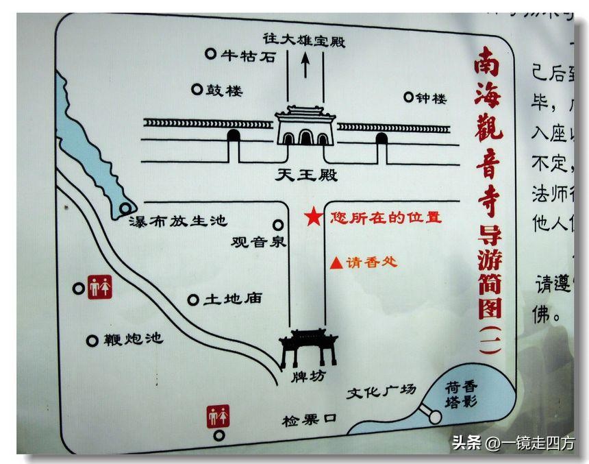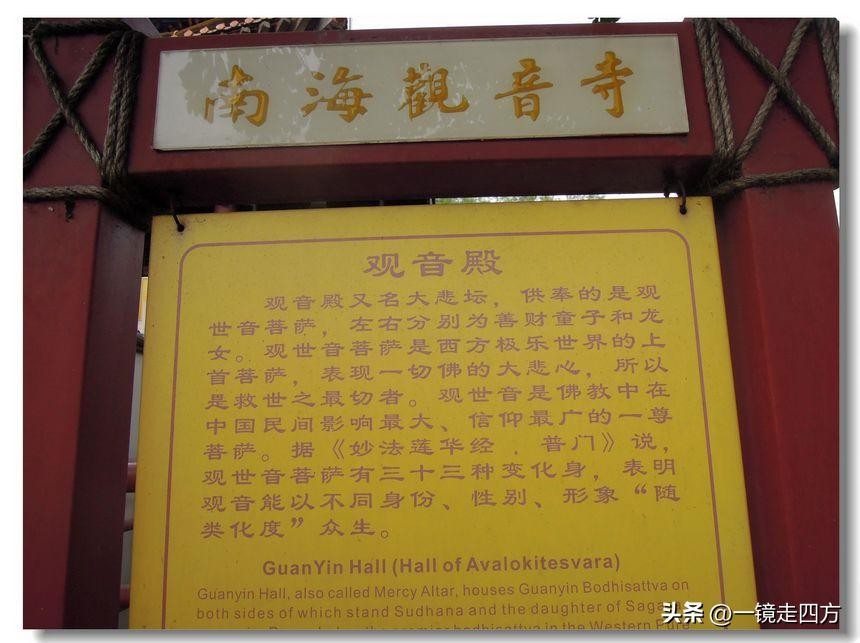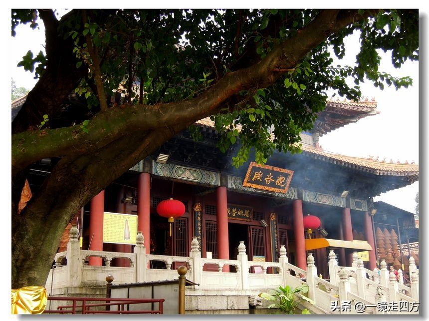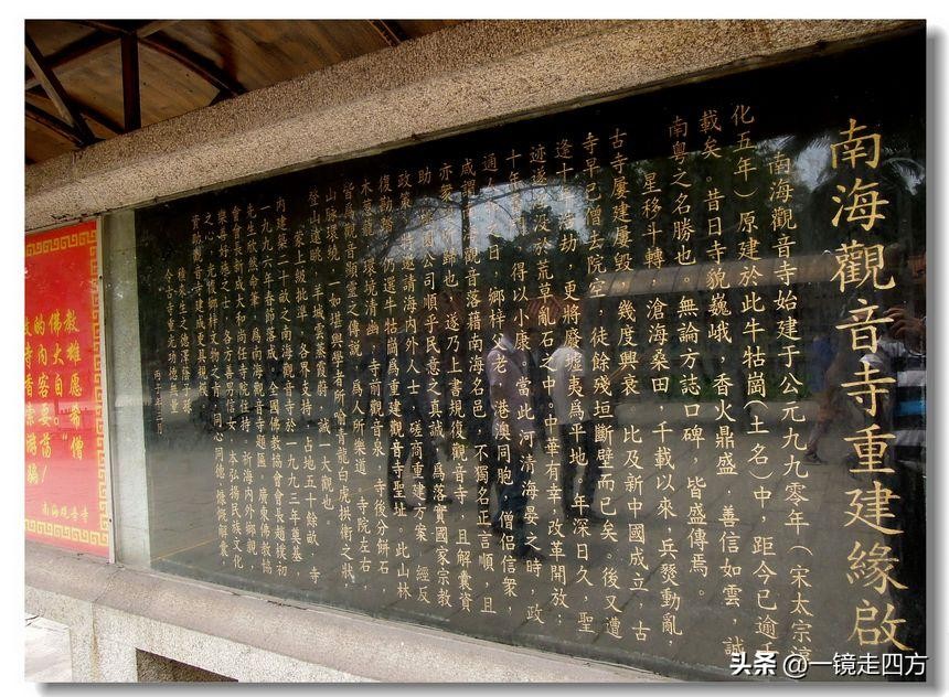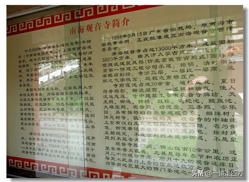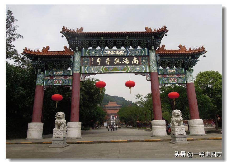 南海观音寺建于宋太宗淳化五年(990年),距今已有一千年历史,1996年2月12日对外开放。观音寺是属于宫殿式寺宇,中轴线上有汉白玉九龙朝阳及莲花浮雕,名为御道,也就是过去皇帝所行的道路称。寺前有30余亩的放生池,遍植莲花,夏日荷香塔影,柳浪闻莺。观音寺距广州、佛山皆为12公里,交通方便、信众甚多,已成为南海市最大的佛门圣地。