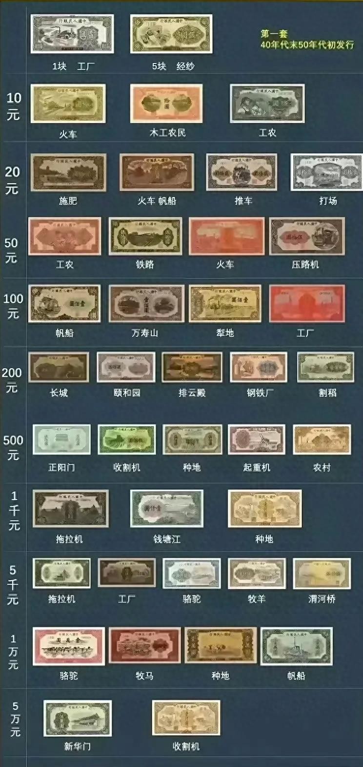 自新中国成立以来,中国一共发行了五套人民币。每套人民币都有其独特的特征和历史背景。