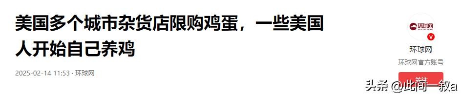 环球网:2025年2月14日《美国多个城市杂货店限购鸡蛋,一些美国人开始自己养鸡》