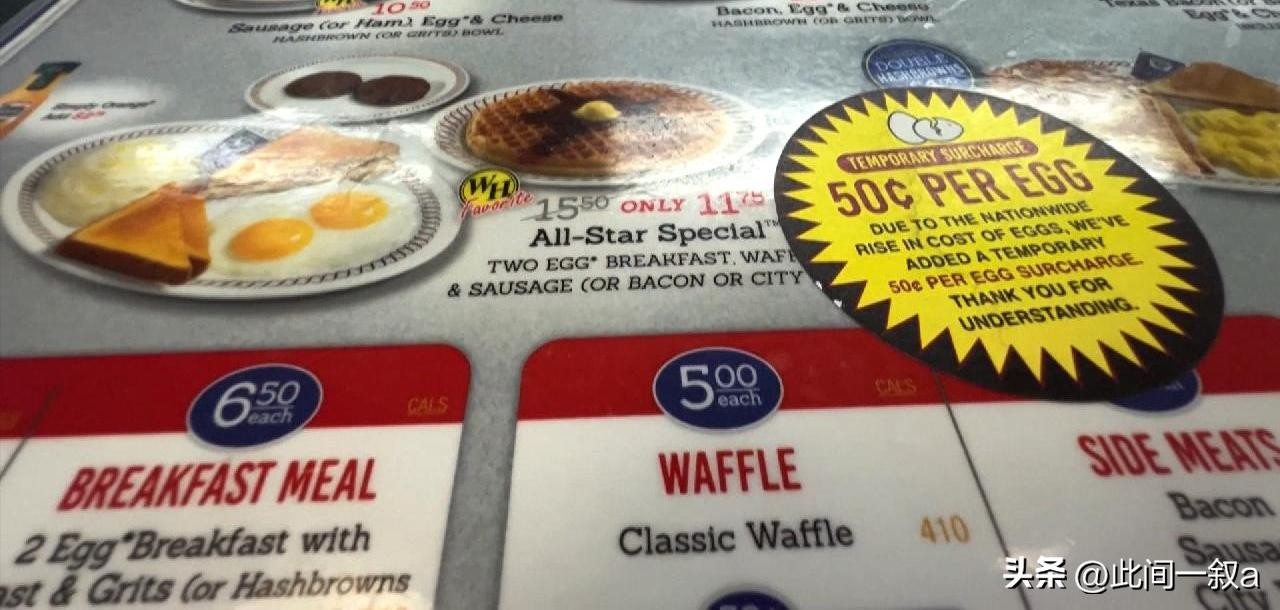 普通民众尚且如此,更不要说需要购买大量鸡蛋的餐饮行业了,美国连锁餐厅华夫饼屋就宣布,要向顾客收取每个鸡蛋50美分的附加费,意味着在外吃一个鸡蛋就要多交3.6元人民币。