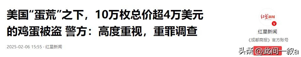 红星新闻:2025年2月6日《美国“蛋荒”之下,10万枚总价超4万美元的鸡蛋被盗 警方:高度重视,重罪调查》