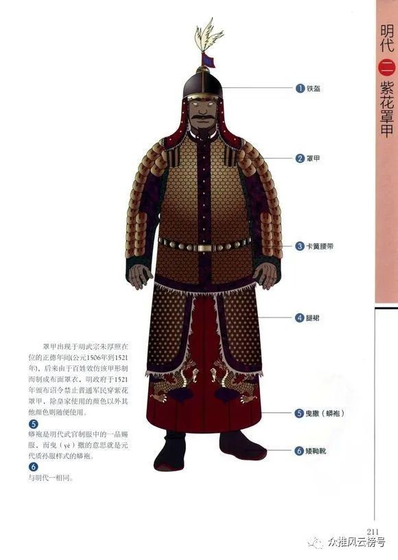 罩甲出现于明武宗朱厚照在位的正德年间(公园1506年到1521年)。后来由于百姓效仿该甲形制而制成布面罩衣,明政府于1521年颁布诏令禁止普通军民穿紫花罩甲,除皇家使用的颜色以外其他颜色则随便使用。