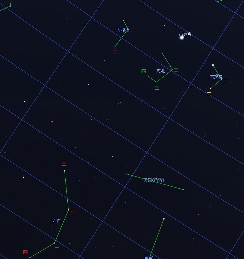 大角:共1星,后增2星,属于牧夫座。是苍龙的角,代表帝座。大角本为角宿星官之一,是青龙的大角尖端,由于它最亮角宿才得以列二十八宿之首,后因其入亢宿2.5度改入亢宿。