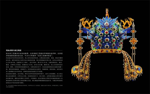 冠上饰十二龙凤,正面顶部饰一龙,中层七龙,下部五凤;背面上部一龙,下部三龙;两侧上下各一凤。龙或昂首升腾,或四足直立,或行走,或奔驰,姿态各异。龙下部是展翅飞翔的翠凤。龙凤均口衔珠宝串饰,龙凤下部饰珠花,每朵中心嵌宝石1块或6、7、9块不等,每块宝石周围绕珠串一圈或两圈。另外,在龙凤之间饰翠云90片,翠叶74片。冠口金口圈之上饰珠宝带饰一周,边缘镶以金条,中间嵌宝石12 块。每块宝石周围饰珍珠6颗,宝石之间又以珠花相间隔。博鬓六扇,每扇饰金龙1条,珠宝花2个,珠花3个,边垂珠串饰。全冠共有宝石121块,珍珠3,588颗。凤眼共嵌小红宝石18块。,十二龙九凤冠,冠上饰十二龙凤,正面顶部饰一龙,中层七龙,下部五凤;背面上部一龙,下部三龙;两侧上下各一凤。龙或昂首升腾,或四足直立,或行走,或奔驰,姿态各异。龙下部是展翅飞翔的翠凤。龙凤均口衔珠宝串饰,龙凤下部饰珠花,每朵中心嵌宝石1块或6、7、9块不等,每块宝石周围绕珠串一圈或两圈。另外,在龙凤之间饰翠云90片,翠叶74片。冠口金口圈之上饰珠宝带饰一周,边缘镶以金条,中间嵌宝石12 块。每块宝石周围饰珍珠6颗,宝石之间又以珠花相间隔。博鬓六扇,每扇饰金龙1条,珠宝花2个,珠花3个,边垂珠串饰。全冠共有宝石121块,珍珠3,588颗。凤眼共嵌小红宝石18块。