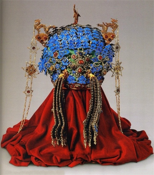 据记载,凤冠早在汉代已经出现。但现今我们能看到的保存完整的凤冠大都来自明代,例如以上这四顶定陵出土的凤冠。这是因为我国明代的封建等级制度发展到顶峰,对服饰、礼仪的规范十分严格。据明永乐三年(1405年)的《明会要》记载,当时规定皇后的凤冠为“九龙四凤冠,漆竹丝为圆框,冒以翡翠,上饰翠龙九金凤四,正中一龙衔大珠一,上有翠盖,下垂结珠,余皆口衔珠滴。珠翠云四十片,大珠花十二树,小珠花如大珠花三数”。