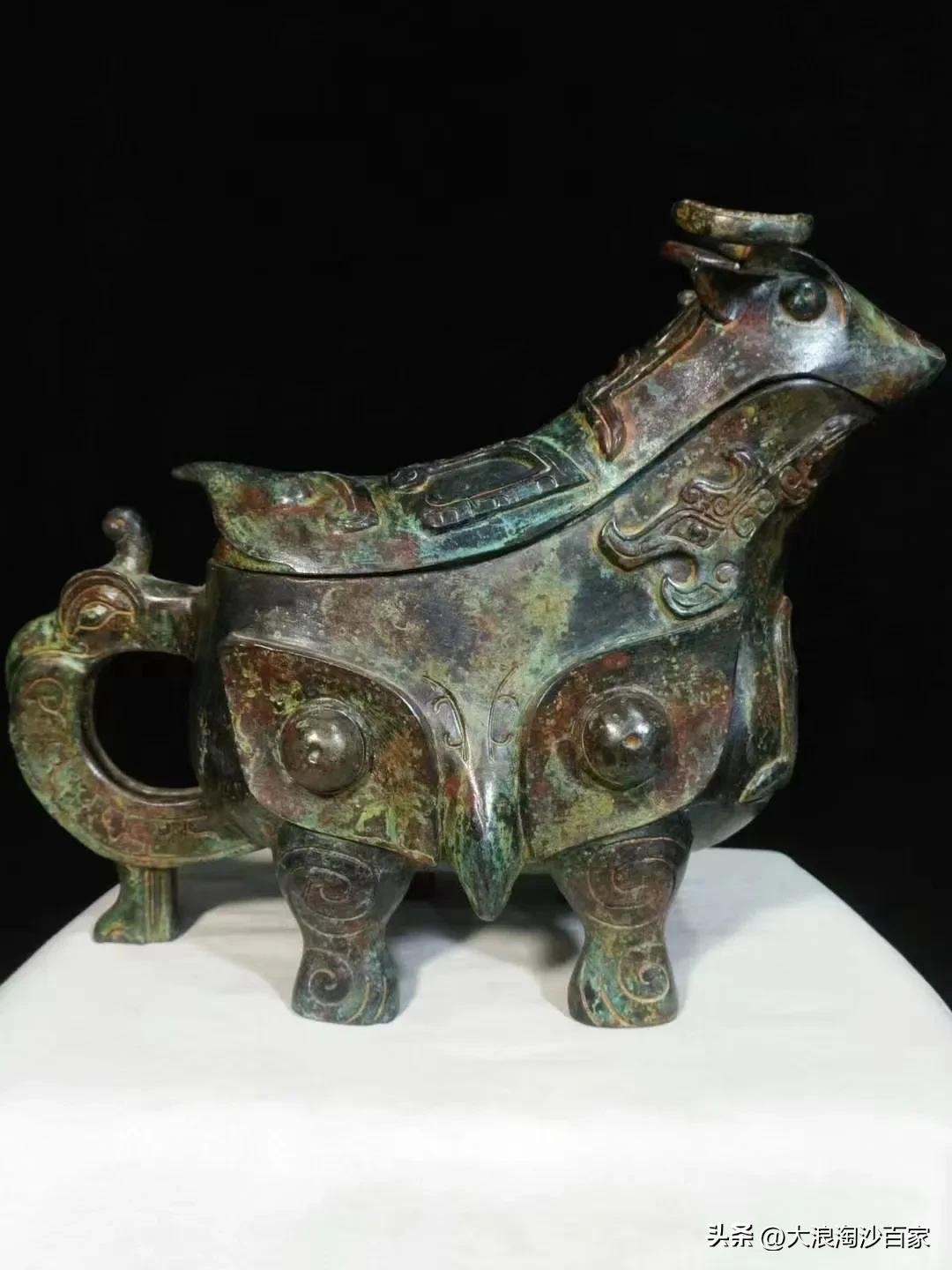 《牛觥》礼器容酒器、纹饰精美、通体采用神话传说猫头鹰装饰,表现出强烈的祭器特征,极其欣赏价值。