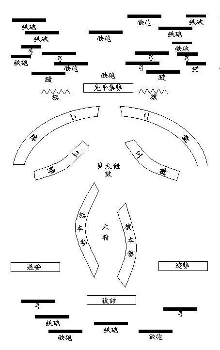 鹤翼阵如同鹤翼一般横向展开,两侧双翼向前推进。随着敌人深入,可将敌人团团围住,获得战场优势。亚历山大在印度进行会战就采用了这种阵型。