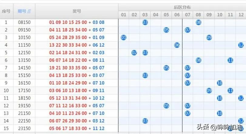 大乐透第24150期:龙头08凤尾33,后区03、12。历史同期走势图表