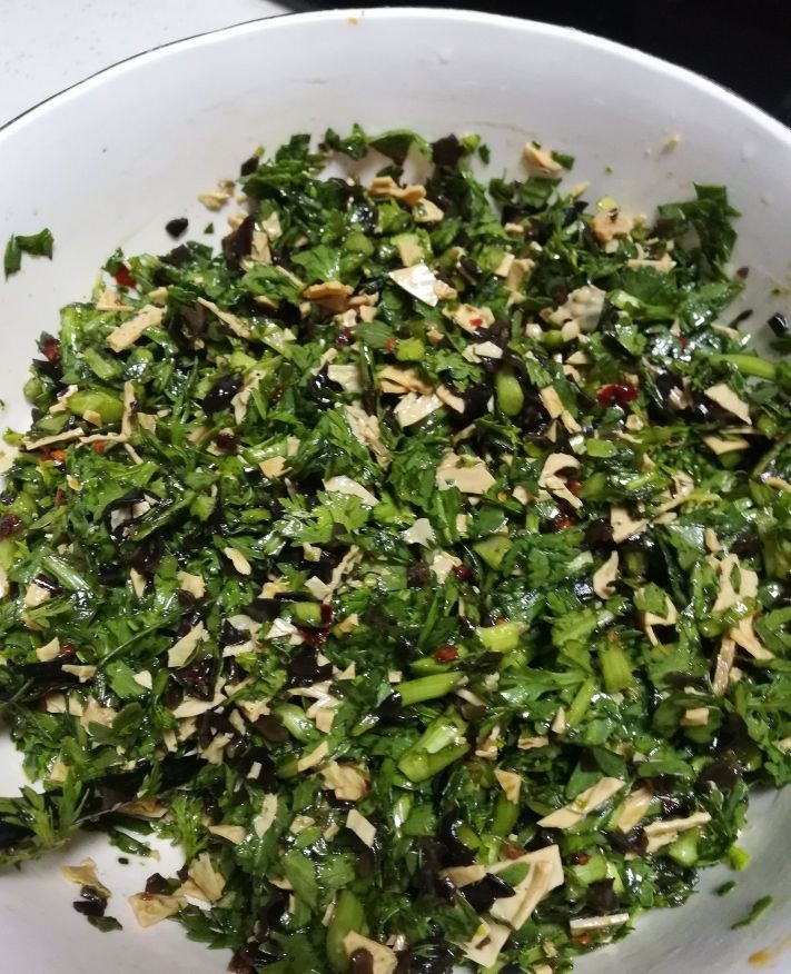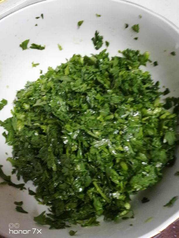 把皇帝菜清洗干净,切碎放在一个大碗里。再放入食物油锁住皇帝菜的水分,保持皇帝菜的鲜嫩。