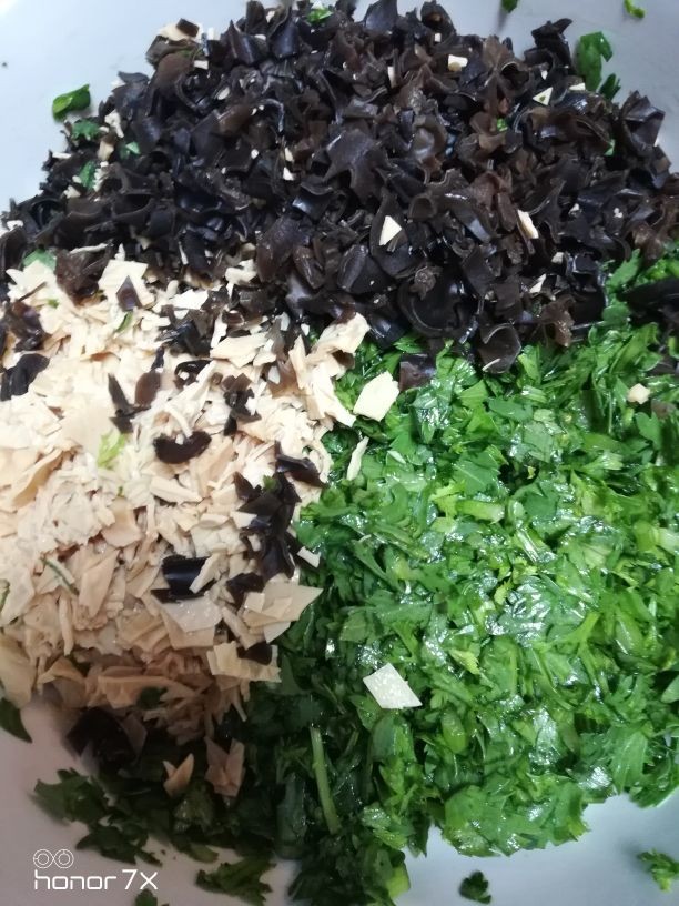 再把清洗好的黑木耳,腐竹切碎,一起放在大碗里。