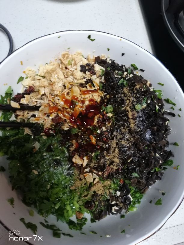 然后放入适量的食物油,盐,辣椒油,五香粉。