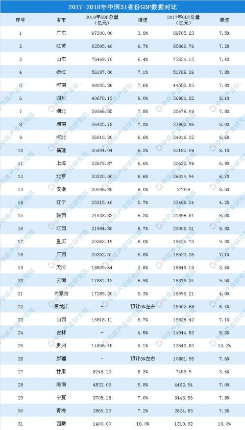 2017-2018年中国31省市GDP数据对比:广东总量第一