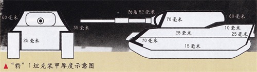 因此“豹”1一开始就背离了火力、机动和防护综合平衡的设计思想。虽然主炮威力与美国M60、法国AMX30大体相当,但火控系统的性能并不如它们;其机动性优于M60,与AMX30相当;其防护性能却是这三个型号中最差的,其各向装甲均为均质轧制钢板,首前装甲厚70毫米、倾角30°,首下装甲厚70毫米、倾角35°尾部装甲厚25毫米、倾角78°,底部装甲厚15毫米,火炮防盾厚60毫米,炮塔防盾装甲厚52毫米、侧面厚60毫米、后部厚60毫米。就综合性能来说,“豹”1是最差的一个,唯一的强项是高可靠性。