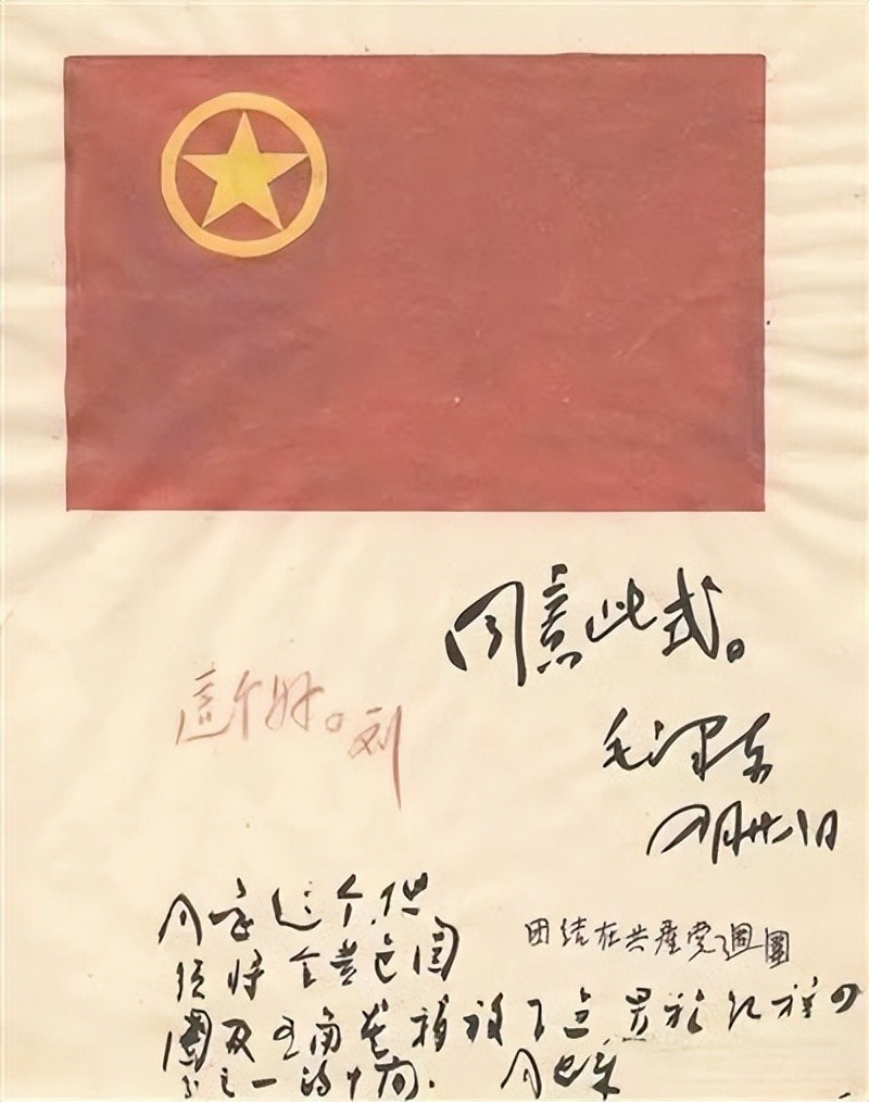 1950年4月28日,毛泽东、刘少奇、周恩来等同志对备选的团旗图案做出批示。