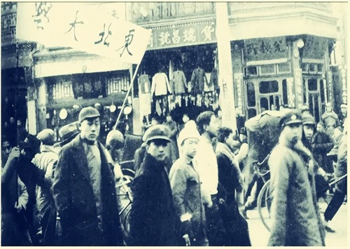 北平大中学生数千人冲上街头,举行声势浩大的游行示威。