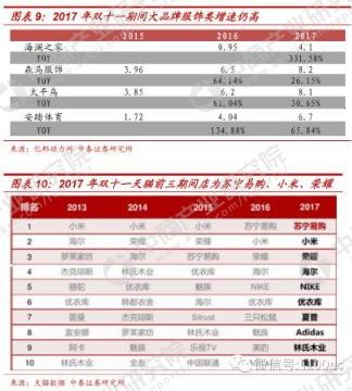 双十一增速超预期,全渠道以及品牌化消费成为促销趋势。2017年双十一电商呈现加速态势,电商总成交额达到2539.7亿元,同口径同比增长43.45%,天猫实现总销售额1682.70亿元,同比增长39.36%,增速较去年环比提升约7.07%,超出市场预期,而京东、苏宁易购增长同样较为优异,新零售元年,全渠道促销成为趋势,天猫、京东、苏宁易购等借助线下门店实现促销、服务以及物流等,提升效率与物流体验,如苏宁易购、茵曼等利用线下门店实现融合促销。平台品牌化消费效应带动客单价的提升,导致销售额整体超预期,而与平台关联度较高,传统品牌增速高于淘品牌增速,品牌化消费的趋势带动客单价提升,客单价相较去年同期提升约11%,消费者消费能力提升。