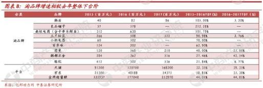 淘品牌增速放缓,如韩后、三只松鼠、茵曼、骆驼等,品牌化消费短暂崛起。通过整体淘品牌双十一的增速情况,淘品牌的整体增速在下台阶,而根据整体情况,我们又对比了传统服饰类品牌增速情况,发现传统品牌的增速仍然保持较高的增速,品牌化消费的趋势较为明显,品牌消费是否能成为趋势,我们认为需要持续观察,天猫的品牌排名搜索具有一定的技术性以及可操作性,需要持续验证品牌化消费的爆发式增长。