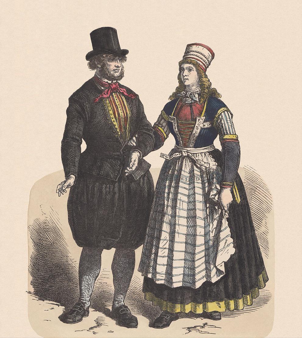 17-18世纪是荷兰黄金时代,荷兰成为了欧洲的商业和文化中心。在这个时期,荷兰的传统服饰逐渐受到外来文化的影响,尤其是来自西班牙、法国和意大利的影响。荷兰贵族和富商开始模仿欧洲其他国家的时尚,引入更多的细节和装饰,服饰变得更加华丽和多样化。同时,农民阶层的传统服饰也保留了一些传统元素,但也融入了一些新的设计和细节。