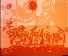 剪纸片的画面主要采用中国绘画的方式,即散点透视,讲究构图的完整性,不苛求细节,镜头内的主客观变化几乎没有,具有舞台化的视觉效果。