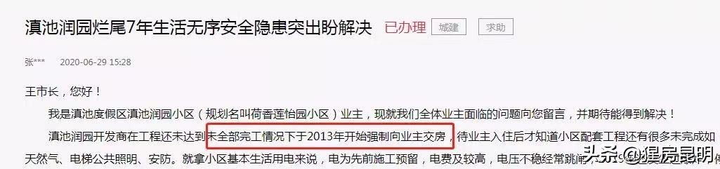因开发商资金链断裂,滇池润园一直处于烂尾状态,据项目业主表示,项目已烂尾7年,如今仍未达到交房条件。
