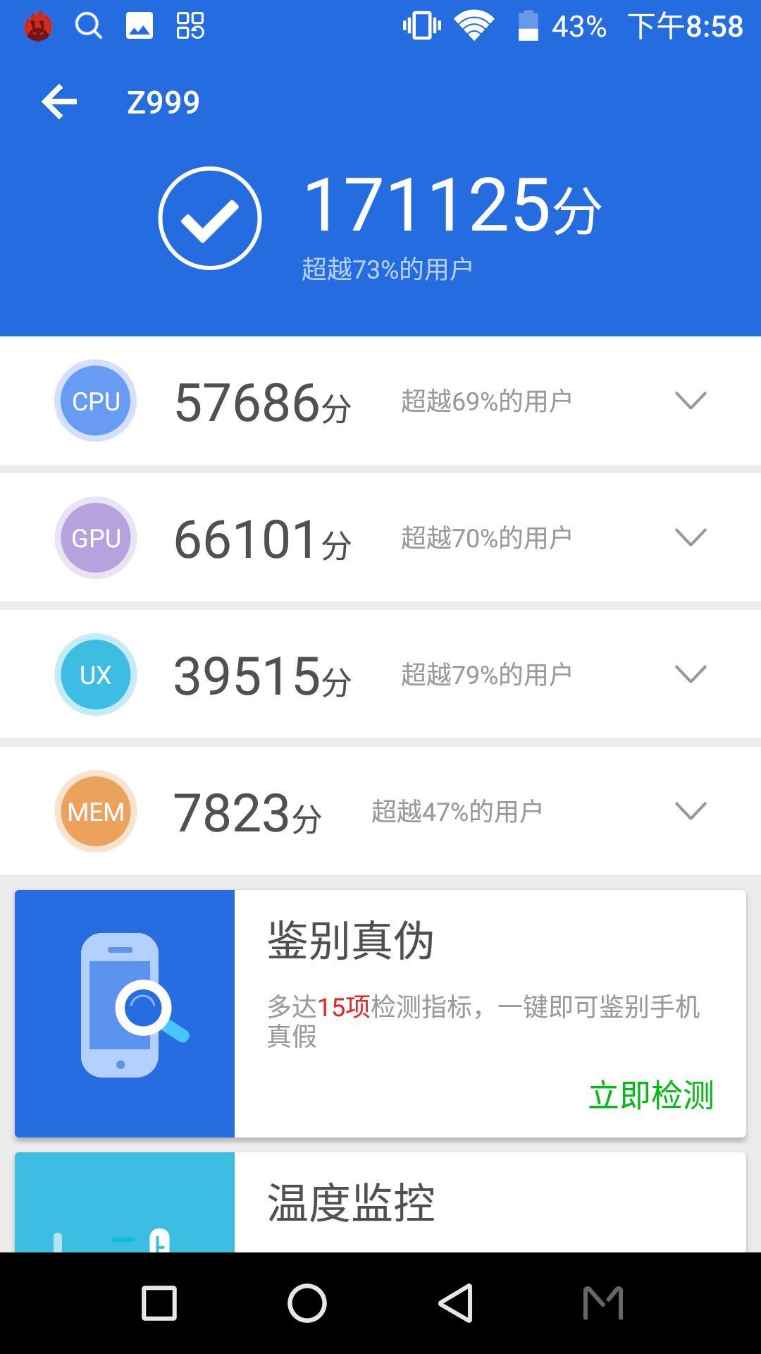 我们使用安兔兔跑分软件进行跑分测试,得到了171125分的成绩,不过安兔兔跑分软件重新升级之后,所有手机的成绩都普遍偏高。