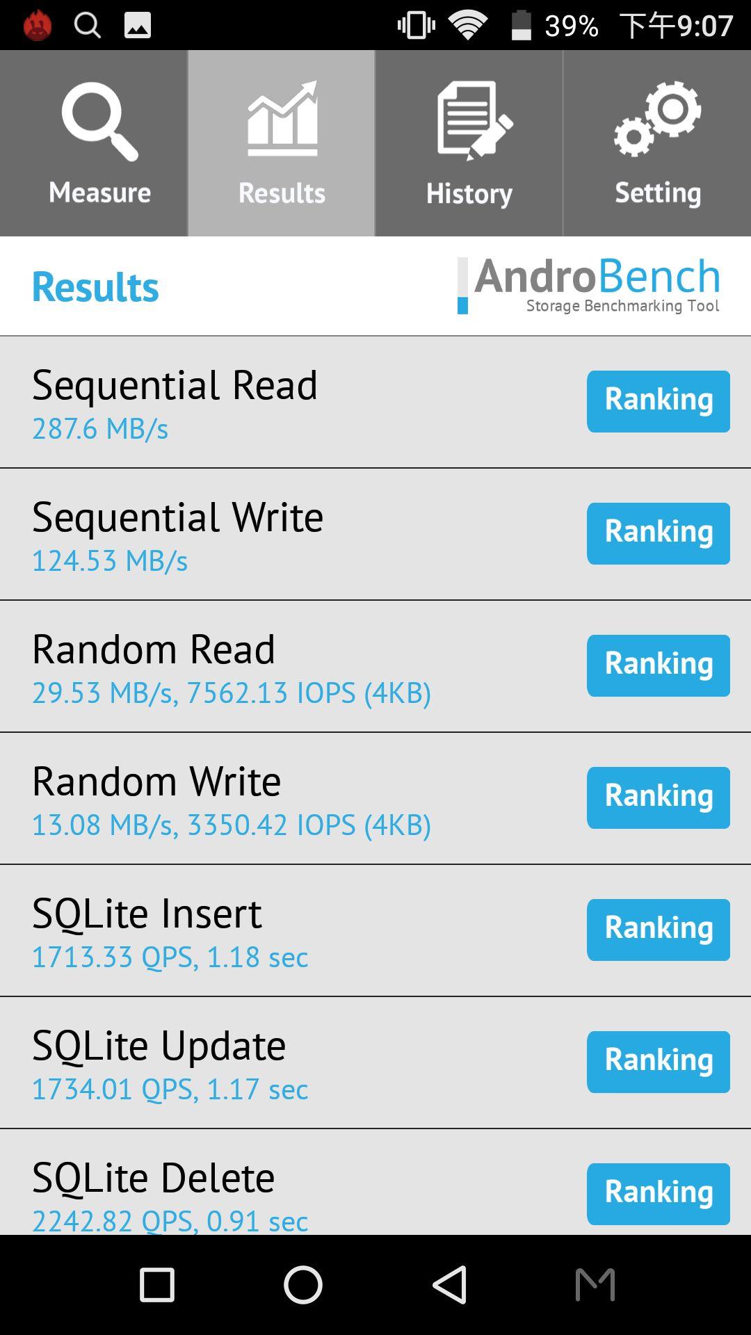 使用Androbench进行内存读写测试,随机读取287.6MB/s,随机写入124.53MB/s,连续读写速度也分别为29.53MB/s和13.08MB/s,这确实符合eMMC5.1的特性。