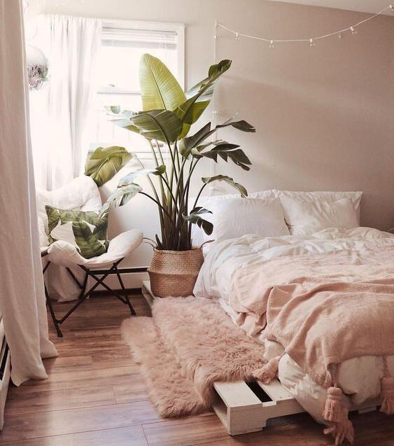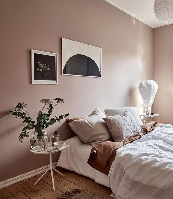 尘土飞扬的玫瑰色、淡紫色、奶油色调和优雅的米色点缀,将有助于将这个空间融为一体。它轻盈,平静,为您选择添加到卧室的家具和口音作品创造了一个色调锚点。