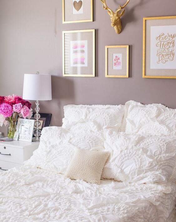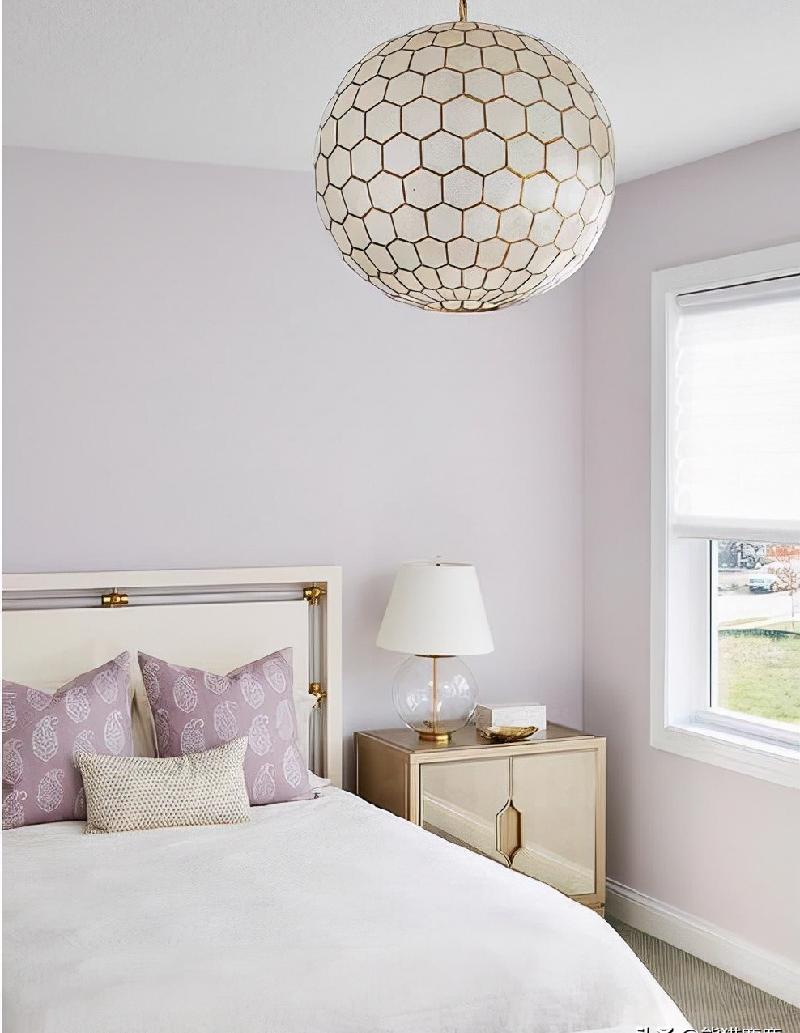 对于那些不想压倒卧室的人来说,这是一个很好的选择。它轻盈,平静,与较浅的色调配合得很好,你可以把整个卧室涂成紫色,或者用这种颜色装饰几面强调墙壁,把空间放在一起。它很微妙,与分层配合得很好。