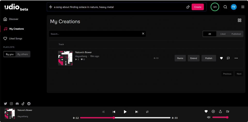 Udio 与 Suno 类似,用户只需输入简单的提示词,比如音乐风格、音乐流派、歌词内容、音色等,等待几秒就能快速生成带有歌词和节拍的音乐片段。如果说 Suno 团队的初衷是降低编曲门槛,让更多普通人深入接触音乐创作,那么 Udio 的野心显然要来得更大,许多音乐人体验后表示 Udio 在器乐和人声的还原度上几乎达到了以假乱真的地步,跳脱出了过去合成音乐 "音与音合成粘连 " 的问题。