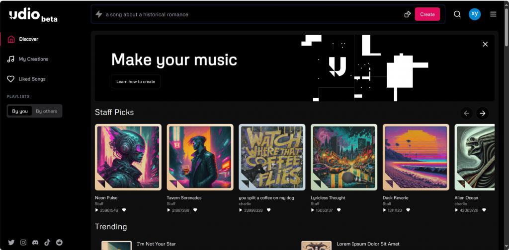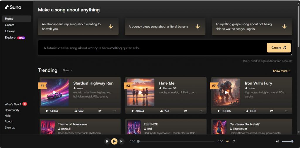 点开Udio 的官网,给人的第一感觉像是某个听歌软件。推荐优秀作品吸引了小雷的注意,反而置顶的创作栏在一众五颜六色的图标中显得有些不起眼,很容易让人忽视。Suno 页面布局相对合理,起码能让第一次使用的用户快速找到创作入口。