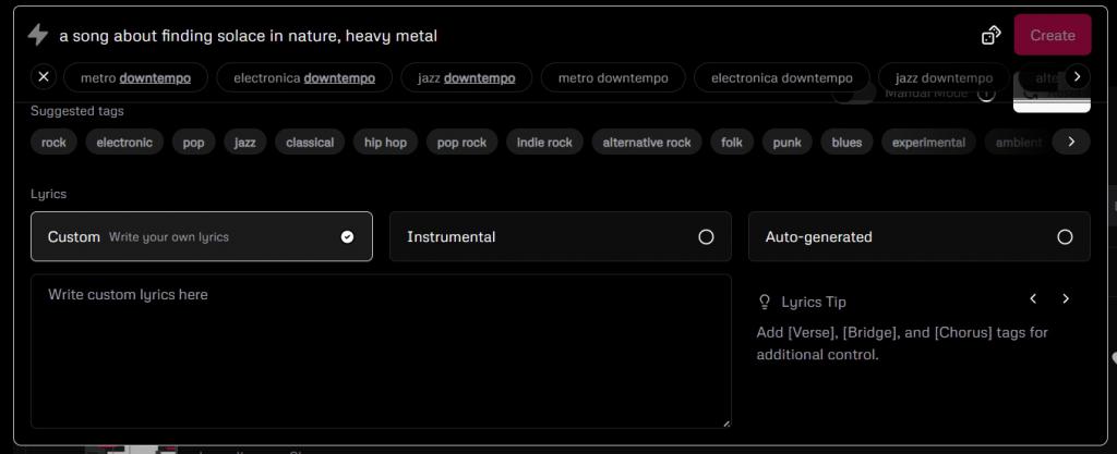 不仅如此,Udio 创作栏提供推荐关键词,其中包括内容、歌曲流派等,能节省用户自行查阅的时间。同样的,Udio 支持用户自定义歌曲的歌词,只需要在自定义歌词选项卡中填写文本就可以,如果你实在想不出,也可以让 AI 自动生成歌词。