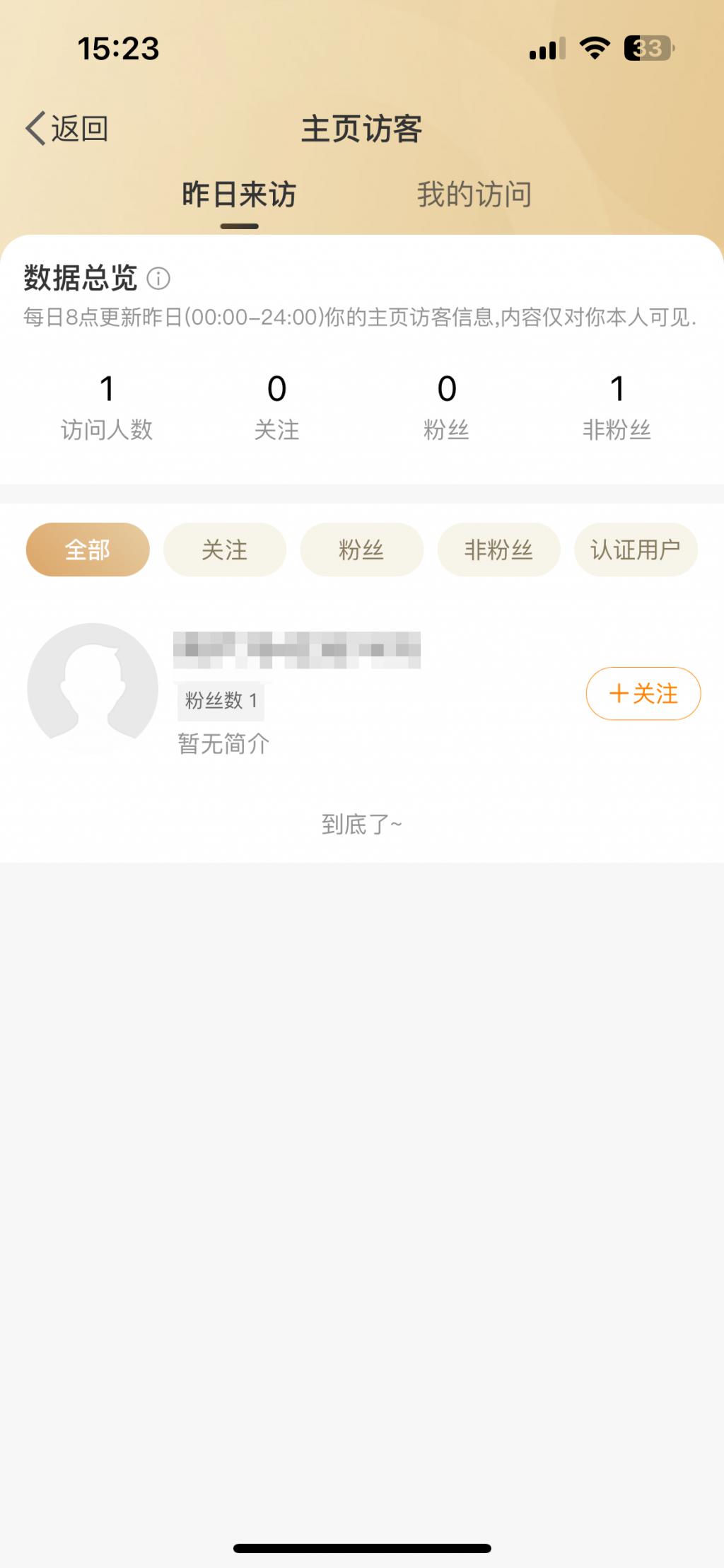 用户如果访问了微博博主的主页,就会留下记录,第二天,用户的访问行为,就会出现在博主的 " 昨日来访 " 中,而且还能对访客进行 " 关注 "、" 粉丝 "、" 非粉丝 " 以及 " 认证用户 " 分类。