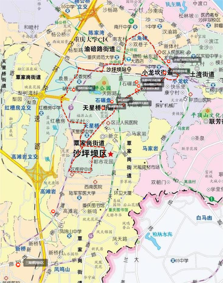 覃家岗街道、渝碚路街道、沙坪坝街道、小龙坎街道、天星桥街道、土湾街道、新桥街道、双碑街道、石井坡街道、童家桥街道、磁器口街道、山洞街道、井口街道、联芳街道、歌乐山街道、中梁镇等 16 个镇街(见附图 1)。