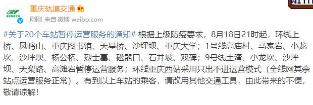 来自重庆轨道交通的消息:根据上级防疫要求,8 月 18 日 21 时起,环线上桥、凤鸣山、重庆图书馆、天星桥、沙坪坝、重庆大学;1 号线高庙村、马家岩、小龙坎、沙坪坝、杨公桥、烈士墓、磁器口、石井坡、双碑;9 号线土湾、小龙坎、沙坪坝、天梨路、高滩岩暂停运营服务;环线重庆西站采用只出不进运营模式(全线网其余站点运营服务正常)。有到以上车站的乘客,请改用其他交通工具。