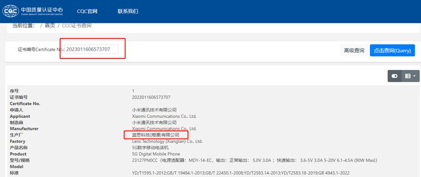 组装方面,据中国质量认证中心信息显示,小米 14 新机生产厂为蓝思科技(湘潭)有限公司。